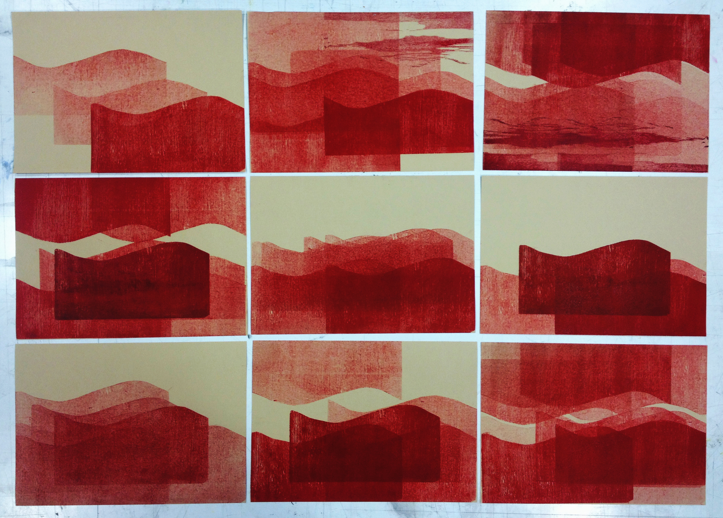 Vue de l’ensemble de la série « Variations // Mers » Série « Variations // Mers » Gravure sur bois Impression sur papier couché Pop’set EA //