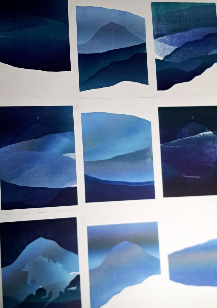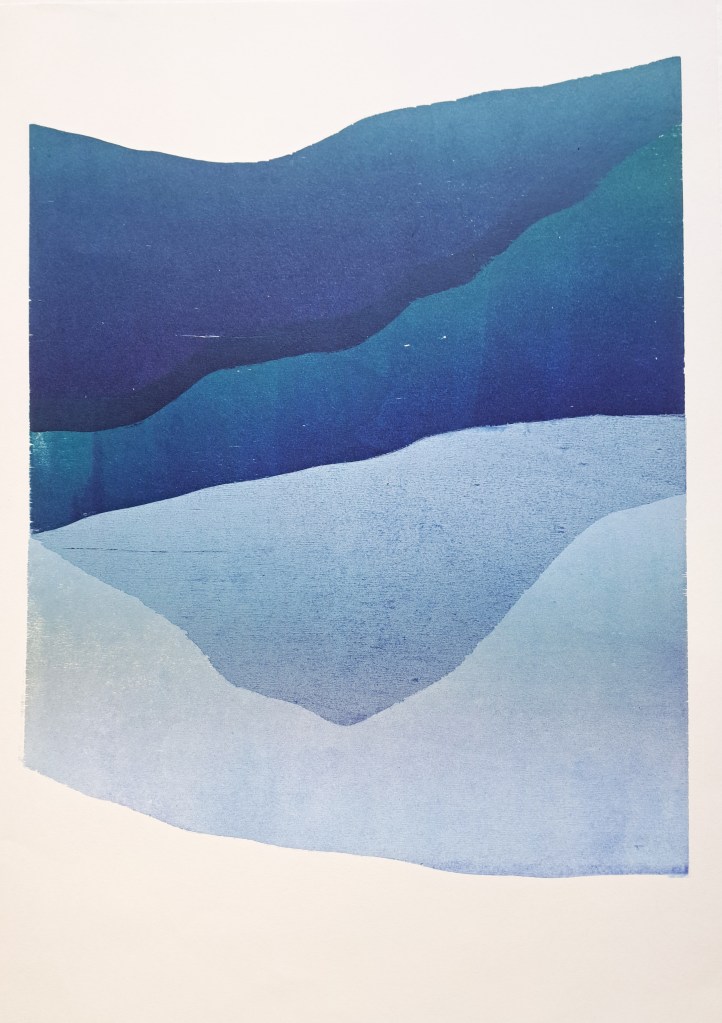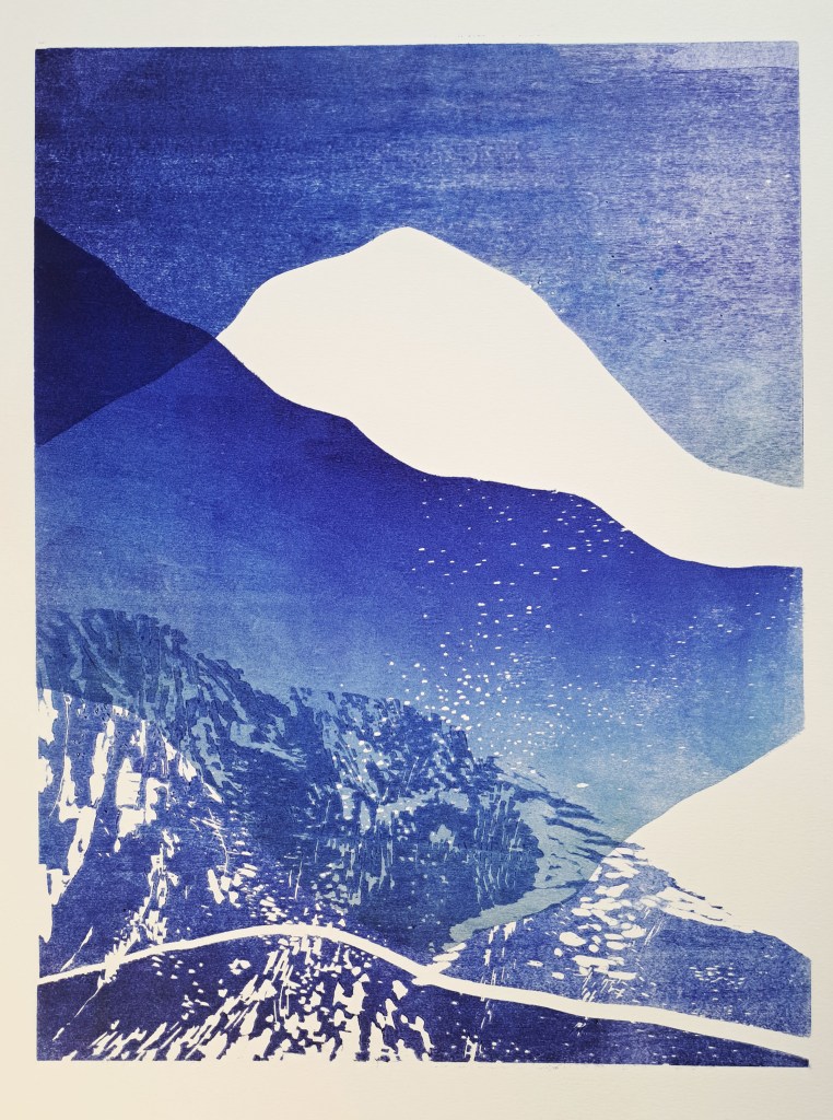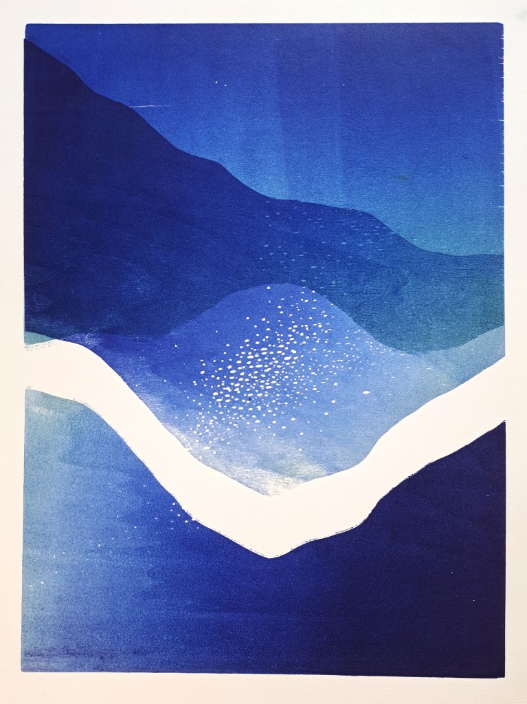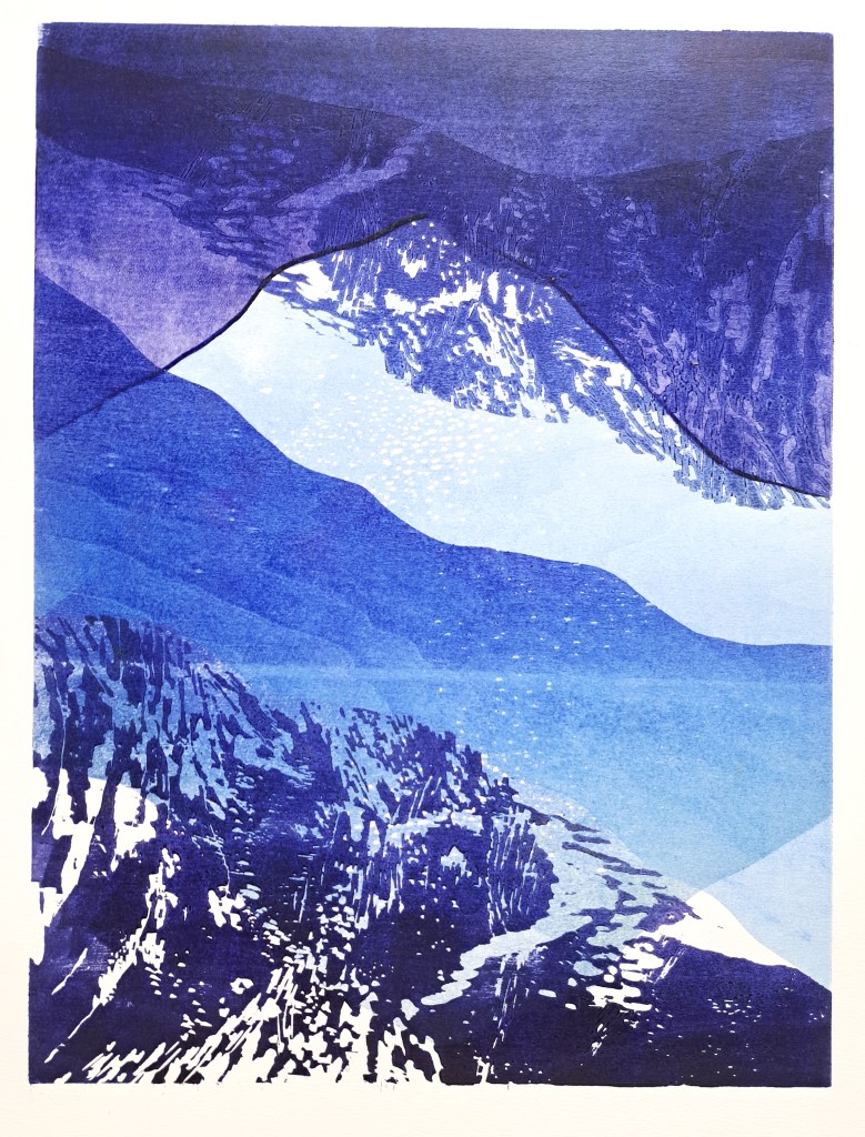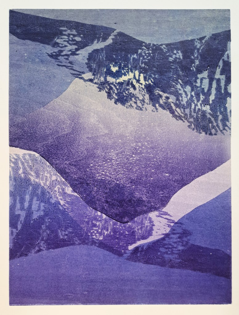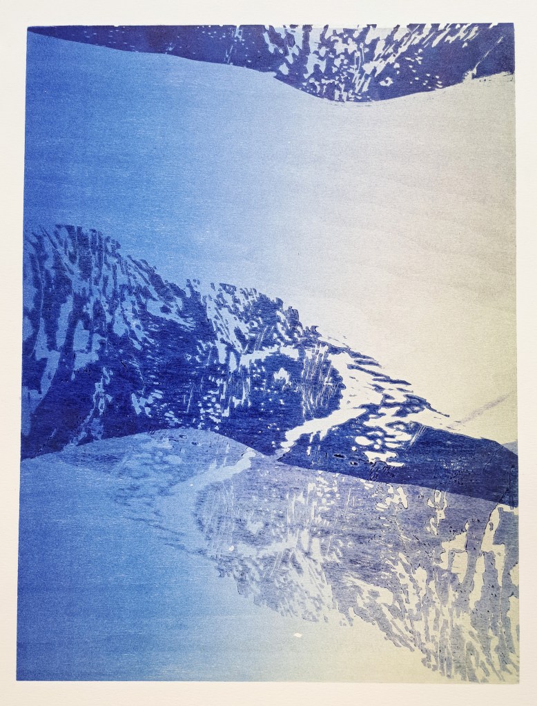 RIVIÈRES GLACIAIRES, Série de gravure sur bois, impression monotype couleur sur papier Clairefontaine 250g, 50×70 cm, 2024