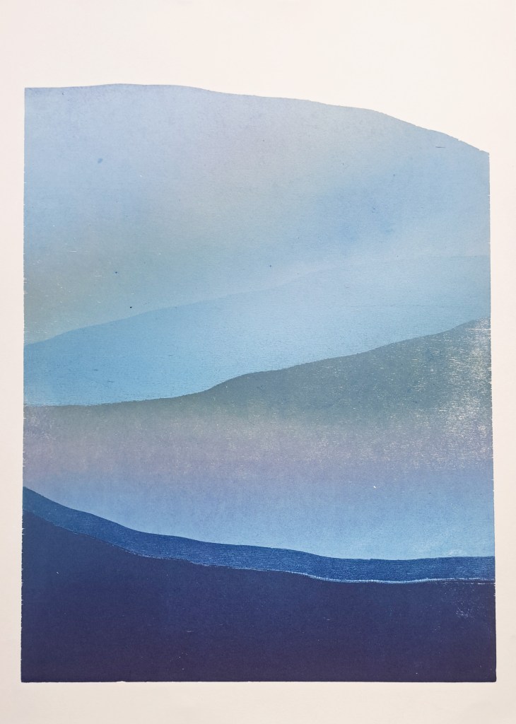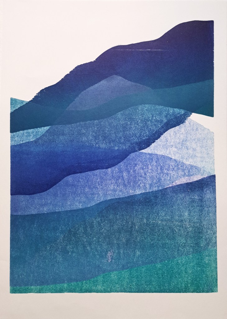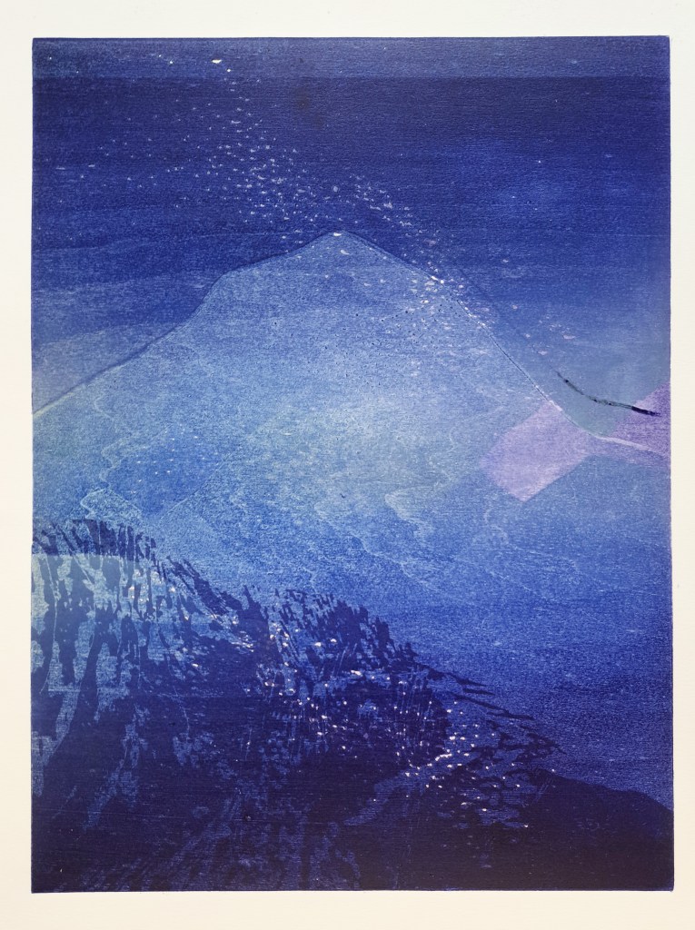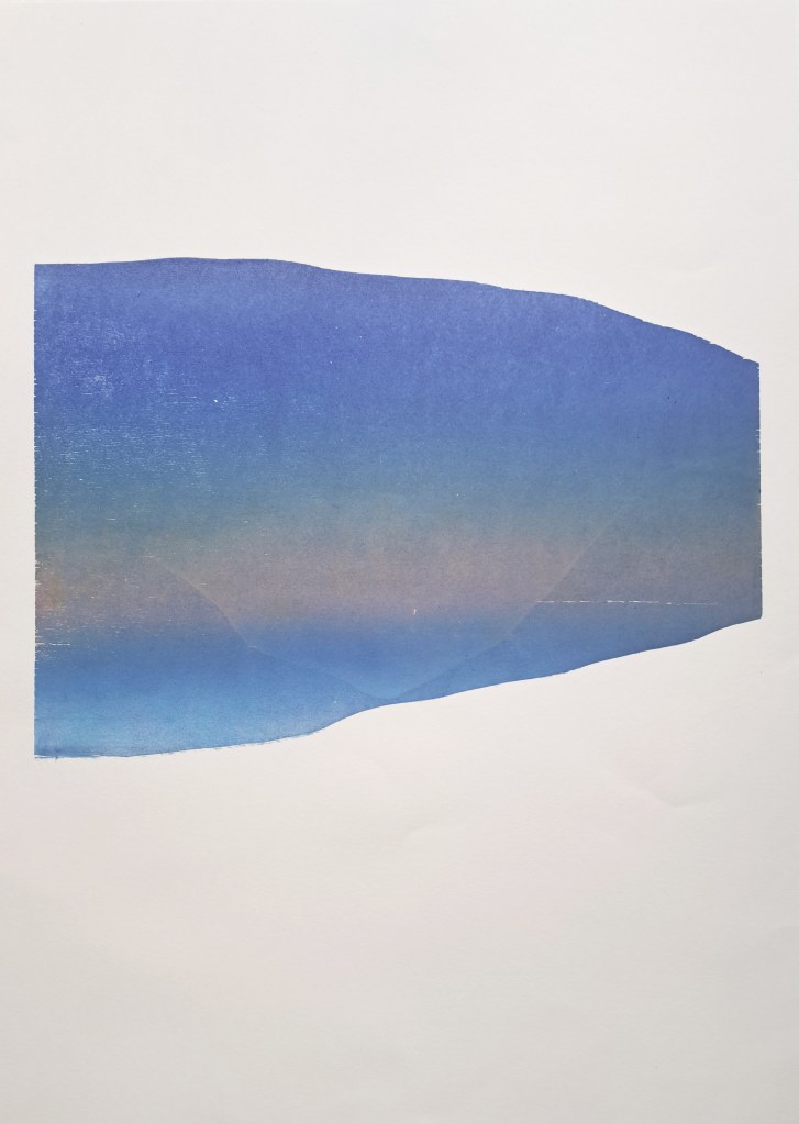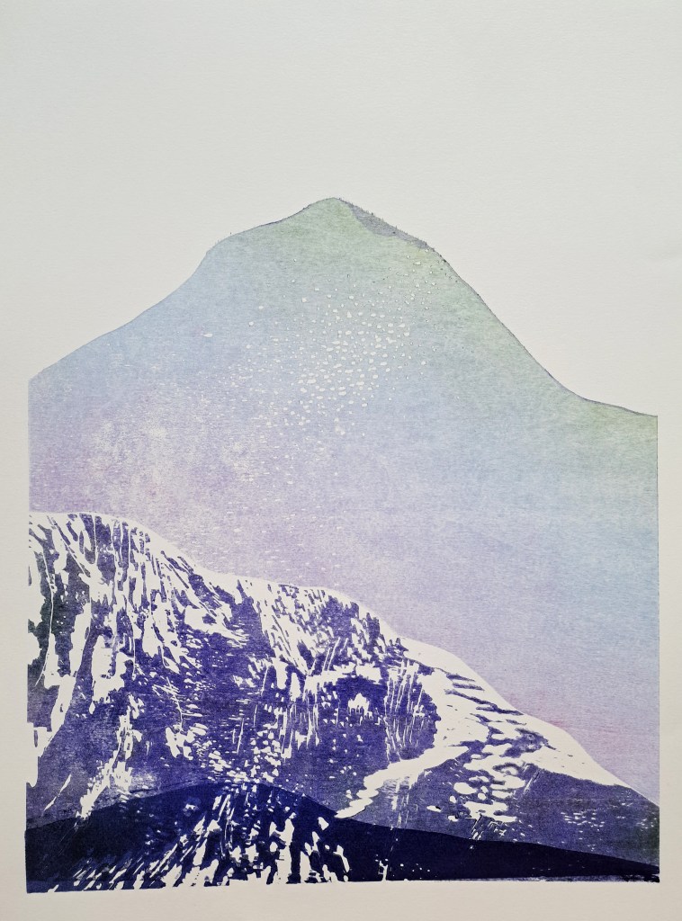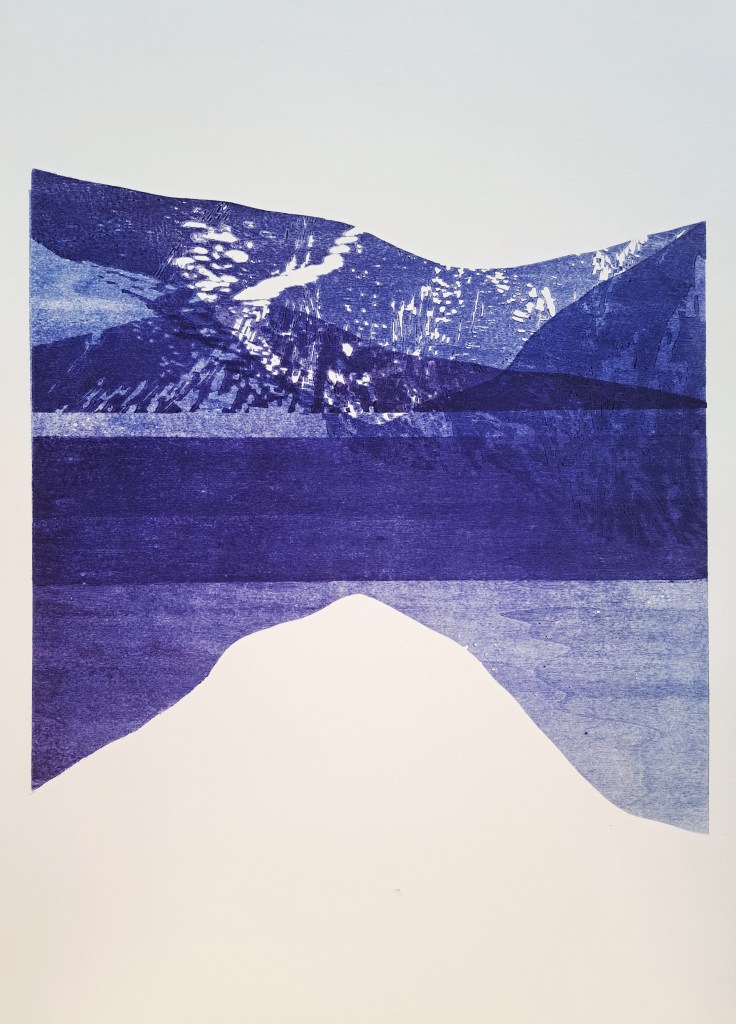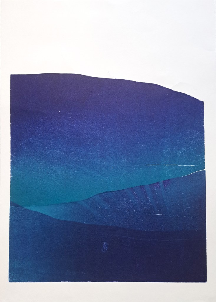 RIVIÈRES GLACIAIRES, Série de gravure sur bois, impression monotype couleur sur papier Clairefontaine 250g, 50×70 cm, 2024