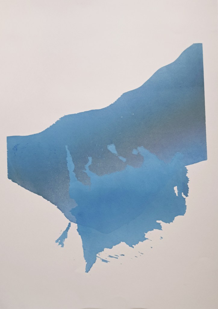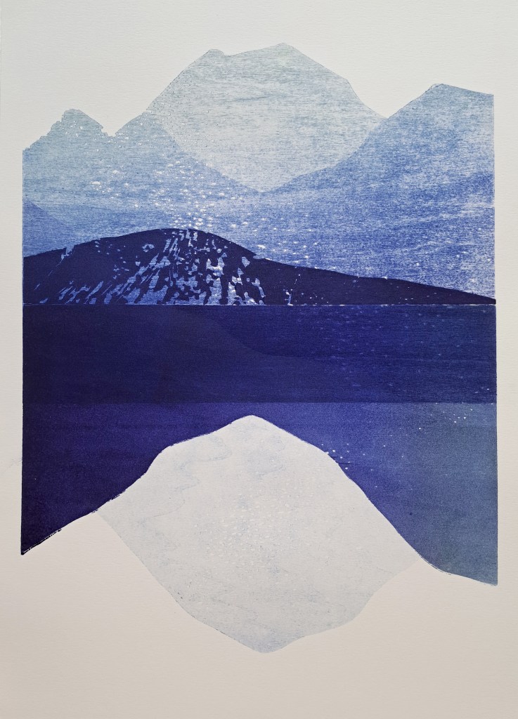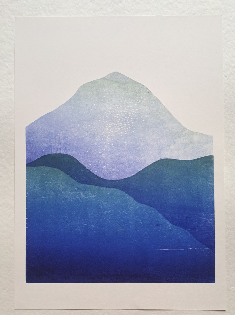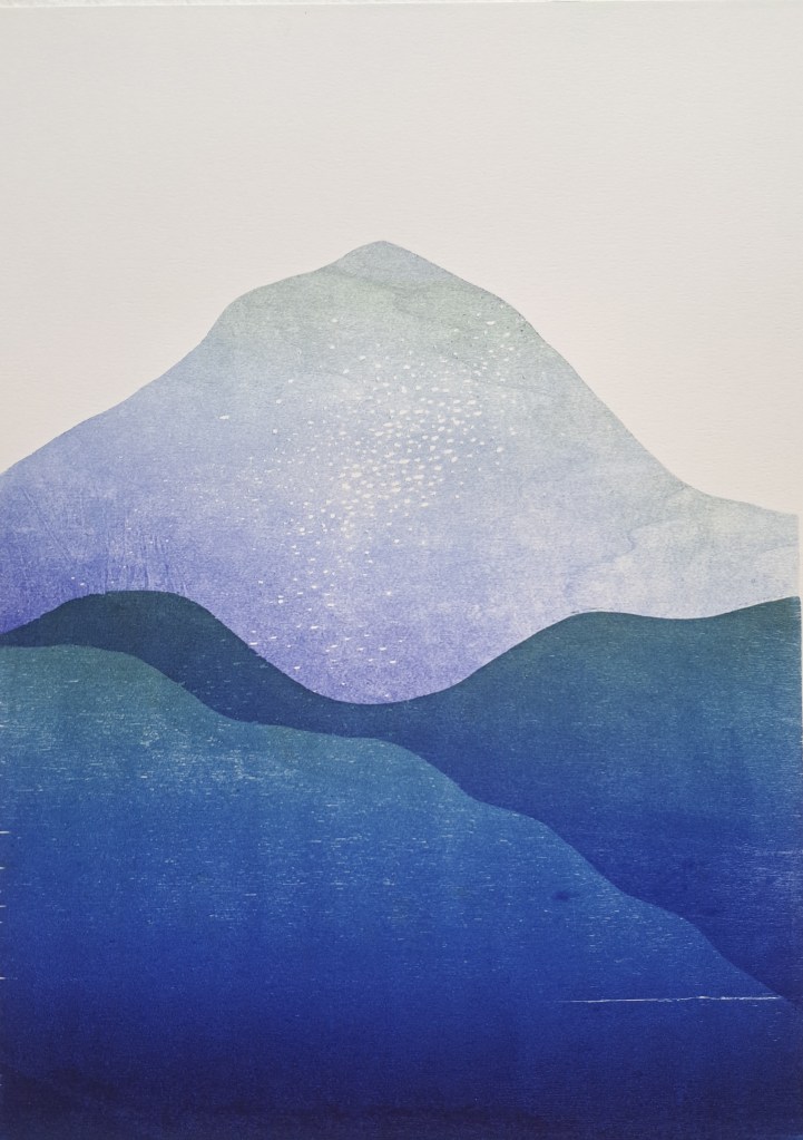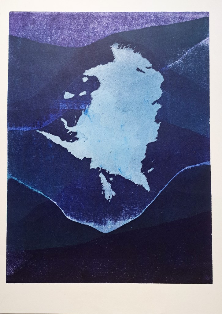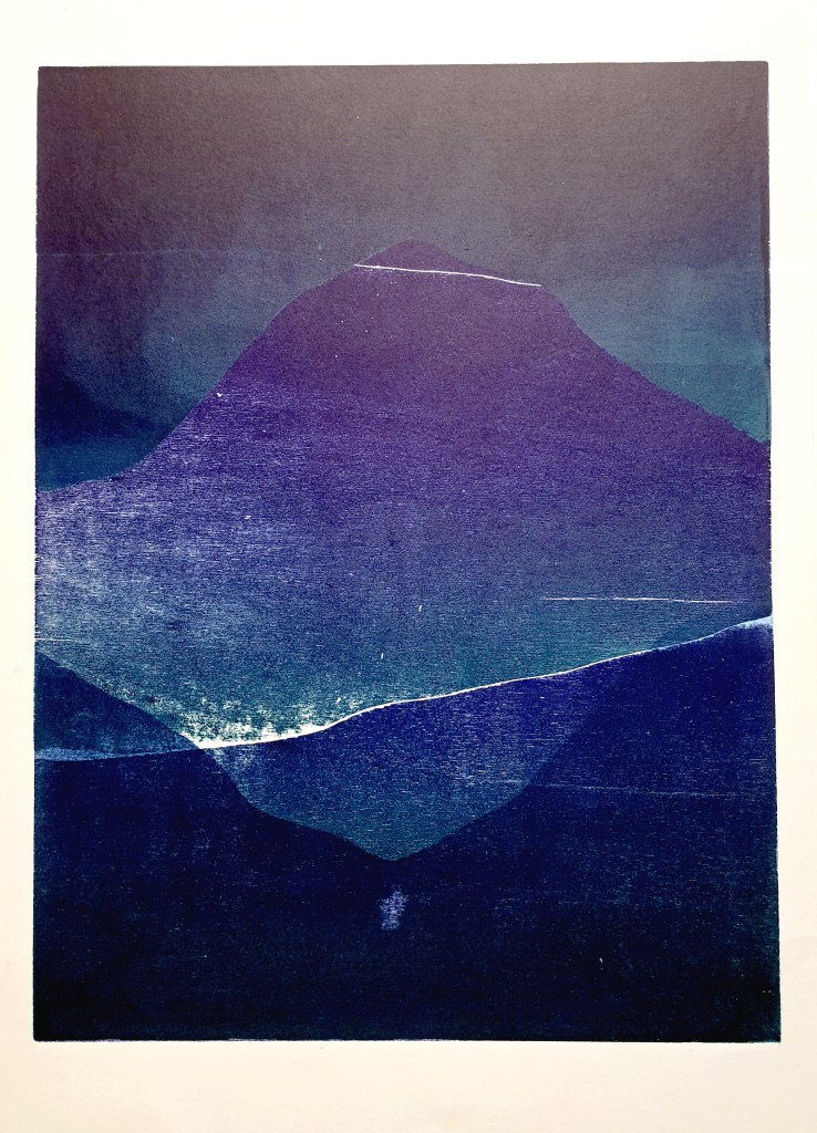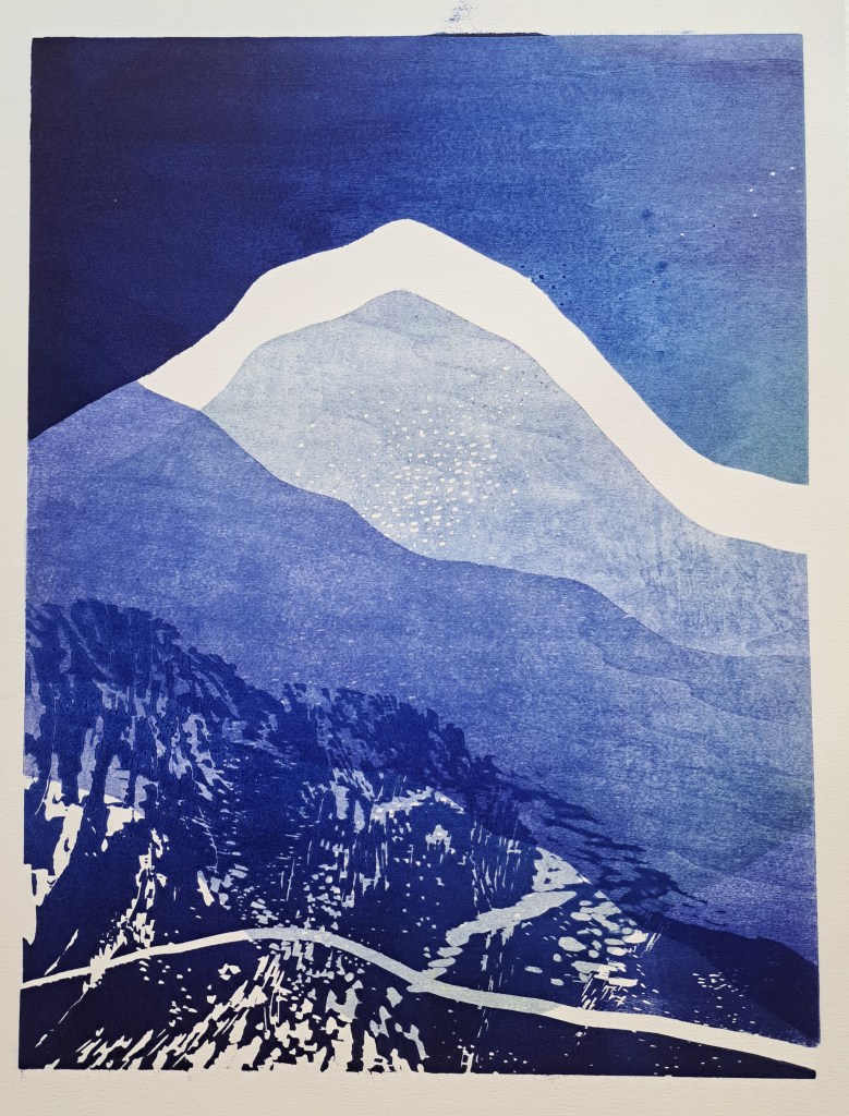RIVIÈRES GLACIAIRES, Série de gravure sur bois, impression monotype couleur sur papier Clairefontaine 250g, 50×70 cm, 2024